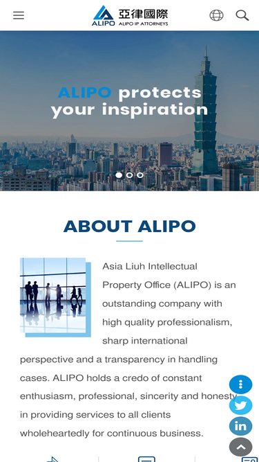 93%ALIPO, located in the middle section of Taiwan, R.O.C – Taichung City, is a professional IP law firm providing comprehensive services relevant to the intellectual property matters to all clients ranging from individuals, small and medium sized businesses, multi-national corporations as well as foreign associates.