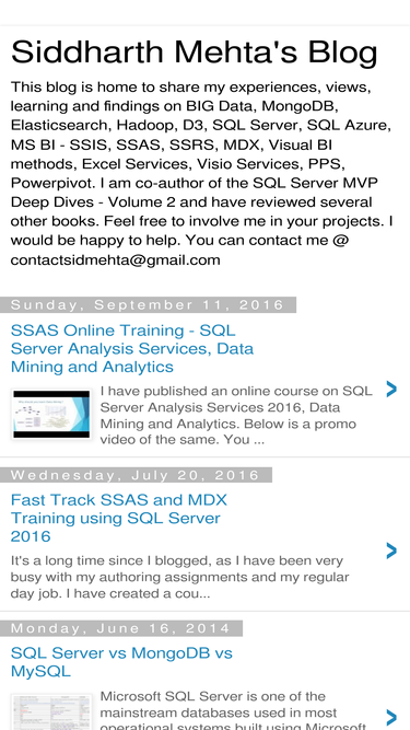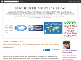 89%This blog is home to share my experiences, views, learning and findings on BIG Data, MongoDB, Elasticsearch, Hadoop, D3, SQL Server, SQL Azure, MS BI - SSIS, SSAS, SSRS, MDX, Visual BI methods, Excel Services, Visio Services, PPS, Powerpivot. I am co-author of the SQL Server MVP Deep Dives - Volume 2 and have reviewed several other books. Feel free to involve me in your projects. I would be happy to help. You can contact me @ contactsidmehta@gmail.com