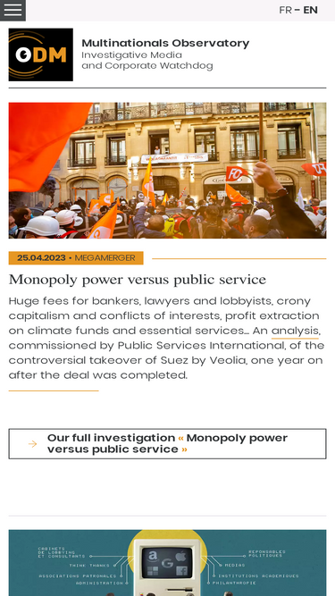 100%L'Observatoire des multinationales est un média en ligne sur les grandes entreprises et plus généralement sur les pouvoirs économiques, ainsi que sur leurs relations avec le pouvoir politique. (…)