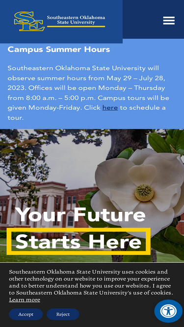 100%东南俄克拉荷马州立大学 中文主页 简体中文 东南俄克拉荷马州立大学 简体中文主页 学校简介 办学宗旨 新生入学申请 转学生入学申请 研究生入学申请 院系专业 国际学生处 英文 东南俄克拉荷马州立大学建立于1909年6月14日,是一所以四年制本科教育为主体,同时开设有硕士学位研究生课程的公立全日制大学。目前学校下辖文理学院,商学院,教育和行为科学学院,及研究生院。东南俄克拉荷马州立大学经由美国高等教育委员会认证,隶属俄克拉荷马州政府高等教育管理系统。 学校地址: Southeastern Oklahoma State Universit