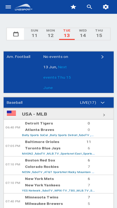95%live sports streaming and tv listings, live scores, results, tables, stats and news for all major sports, including football, basketball, baseball, hockey, soccer, tennis, ufc, nascar, formula 1.