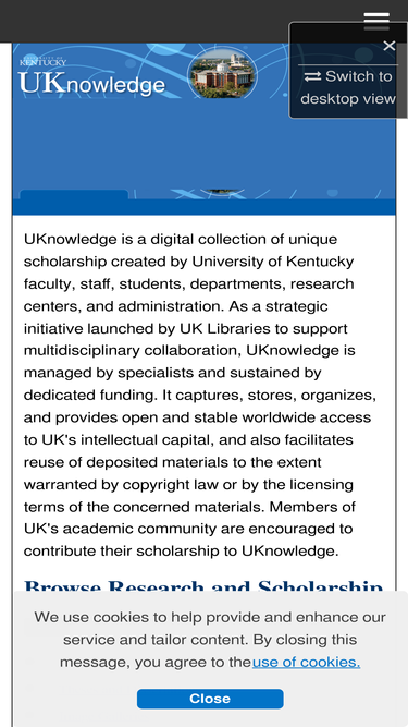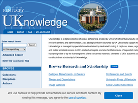 88%uknowledge is a digital collection of unique scholarship created by university of kentucky faculty, staff, students, departments, research centers, and administration. as a strategic initiative launched by uk libraries to support multidisciplinary collaboration, uknowledge is managed by specialists and sustained by dedicated funding. it captures, stores, organizes, and provides open and stable worldwide access to uk’s intellectual capital, and also facilitates reuse of deposited materials to the extent warranted by copyright law or by the licensing terms of the concerned materials. members of uk’s academic community are encouraged to contribute their scholarship to uknowledge.