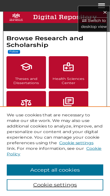 86%unm’s digital repository is an open access institutional repository created to preserve, gather and disseminate scholarship, research and cultural works created by unm faculty, staff and students within unm departments, centers and programs. the repository supports teaching and lifelong learning within the unm campus and broader new mexico community by making deposited materials permanently and freely accessible.