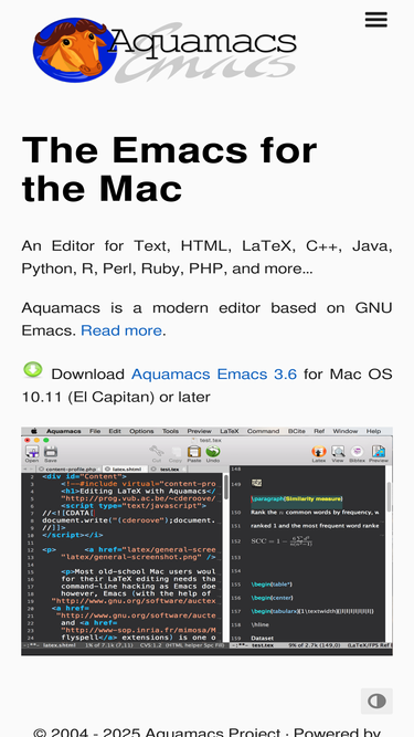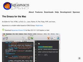 75%An Editor for Text, HTML, LaTeX, C++, Java, Python, R, Perl, Ruby, PHP, and more… Aquamacs is a modern editor based on GNU Emacs. Read more. Download Aquamacs Emacs 3.6 for Mac OS 10.11 (El Capitan) or later