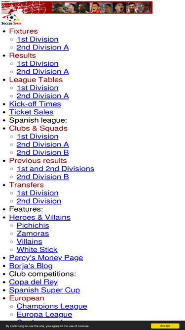 soccer-spain spanish soccer football website in english; la liga fixtures, results, match reports, transfers, news, stats; official spanish club shirts and prints