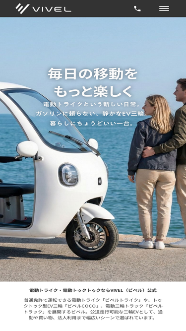 94%3人乗りかわいい電動トゥクトゥク(EVミニカー)を購入するなら「ビベルトライク」。家庭用電源で充電ができ、屋根付きのため雨や強い日差しでも快適に運転が可能です。通勤やレジャー・街乗り・ビジネスなどにおすすめです。