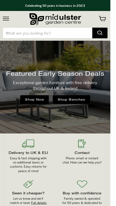 One of NI's leading destination garden centres. Garden furniture specialist delivering high quality outdoor furniture throughout all of Ireland and UK. Brands include Alexander Rose, Kettler and Barlow Tyrie. Artificial Christmas trees and lights specialist.