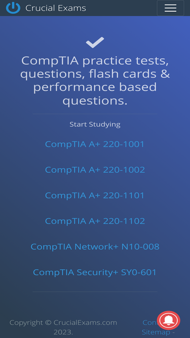 100%Crucial Exams helps you pass your exams with confidence. Access thousands of realistic practice tests, flashcards, and performance-based questions for certifications, academic tests, and professional exams — all in one place.