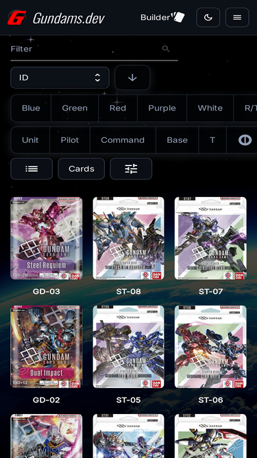 Explore the Gundam Card Game at Gundams.dev. Your ultimate resource for Gundam card game enthusiasts. Find card images, decks, strategies, and connect with other fans.