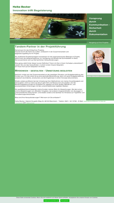 100%Projektmanagement und Koordination - Vorsprung durch Kommunikation und Sicherheit durch Dokumentation.Heike Becker schafft Freiräume für die Fachverantwortlichen. Neugierig und kompetent bietet Heike Becker ihre struktuierte PM-Arbeitsweise in der Medizintechnik, Dokumentation, Softwareentwicklung und Pharma an. Und im Bereich Bildung und Kultur sowie der Kreativwirtschaft.Mit Begeisterung für die Ideen ihrer Kunden im Einsatz - Heike Becker