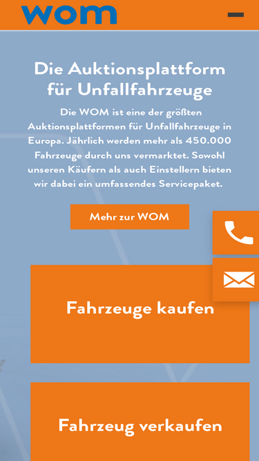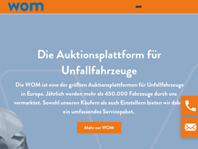 89%die wom ist eine der größten online auktionsplattformen für unfallfahrzeuge in europa. jährlich werden mehr als 450.000 fahrzeuge durch wom vermarktet. sowohl unseren käufern als auch einstellern bieten wir dabei ein umfassendes servicepaket.