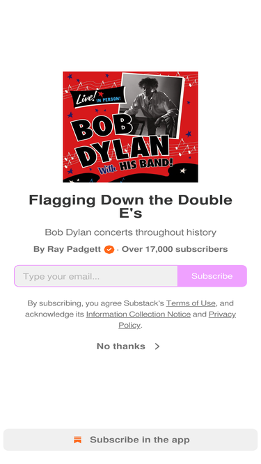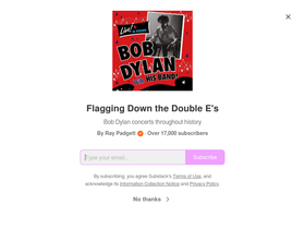 89%Bob Dylan concerts throughout history. Click to read Flagging Down the Double E's, by Ray Padgett, a Substack publication with tens of thousands of subscribers.