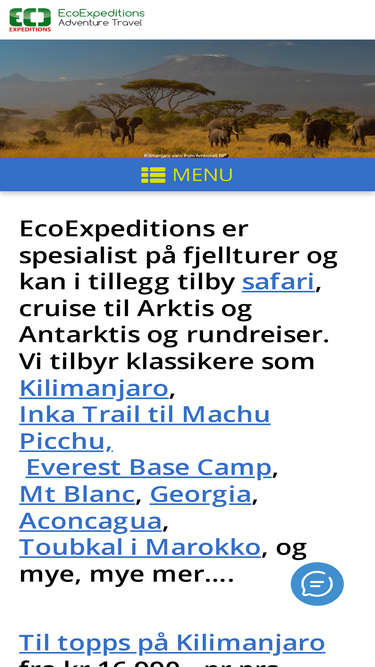 82%bli med erfarne ecoexpeditions til kilimanjaro, machu picchu, everest bc, mt blanc, elbrus, georgia, arktis, antarktis og på safari til afrikas beste parker.