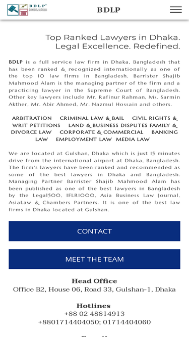 88%Top Ranked Lawyers in Dhaka. Legal Excellence. Redefined. Bangladesh Law Partners BDLP is one of the best multi-disciplinary full service law firms in Gulshan, Dhaka, Bangladesh having offices at Gulshan and Uttara. The law firm is one of the best ranked law firms in Dhaka and represents both foreign and local clients. The firm operates as a partnership of several leading practicing lawyers who work together to represent BDLP's clients and has so far maintained an exceptional success rate overall both in litigation & ADR. The lawyers in Dhaka working as partners, associates and paralegals of BDLP are highly qualified having both local and foreign qualifications and credentials. The present Managing Partner was trained in England having also been called to the Bar of England & Wales as a Barrister of the Honorable Society of Lincoln's Inn. The partners and associates have significant experience and expertise in their respective practice areas ranging from Admiralty, Writ Matters, Corporate, Criminal to private law matters like Divorces & family practice. The law firm's head office is located in Gulshan which is only 10-15 minutes drive (6.2 kilometers) from the Hazrat Shahjalal International Airport, Dhaka and Uttara Residential Area. The other office of the firm is located at Gulshan close to Banani & Gulshan commercial areas and is easily accessible from all areas of Dhaka like Bashundhara Residential Area, Motijheel, Banasree, Rampura, Dhanmondi and Badda. The firm operates under strict ethical guidelines and maintains international standards in handling its affairs. Policy highlights of BDLP are given below: Confidentiality Maintaining Professional Integrity Conflict Checks & Client Selection Pro Bono - Giving Back to the Society Fair Fees Transparency Reducing Unnecessary Red Tape Customer/Client Service with a Smile No to Discrimination & Racism The firm strives to implement a solution oriented approach to provide fast and effacacious remedies