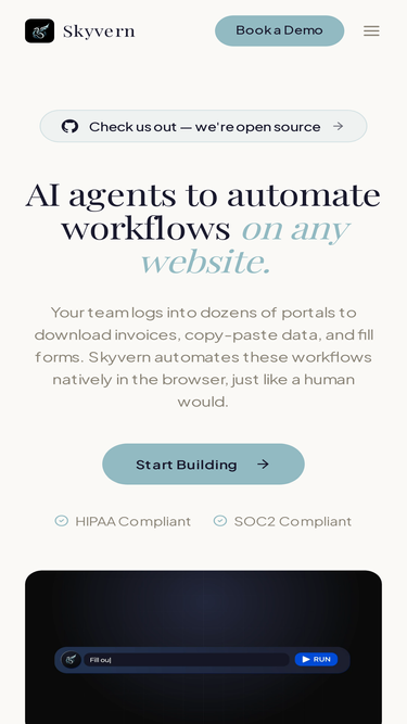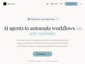 93%Skyvern integrates with various third party tools to help companies automate browser based workflows using LLMs and Computer Vision, fully automating manual workflows and replacing brittle or unreliable scripts.