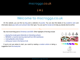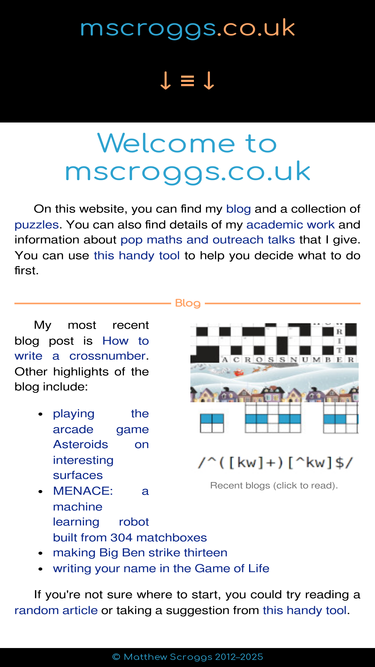 79%i am matthew scroggs. i like maths. on this website, you can find my blog and a collection of sunday afternoon maths puzzles.