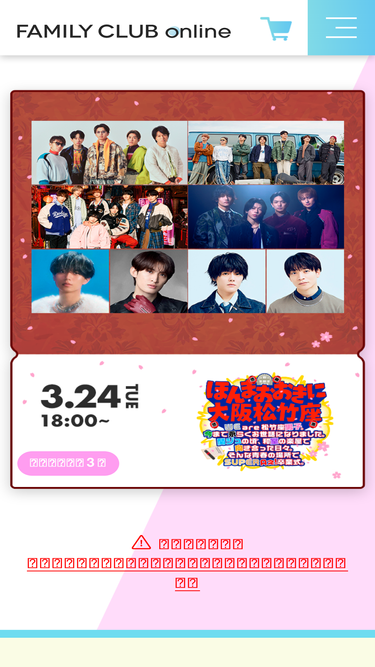 92%FAMILY CLUB online。トップ、お知らせ、公演スケジュール、グッズ、マイページ、はじめての方へ、ご利用ガイドなどの情報を掲載。