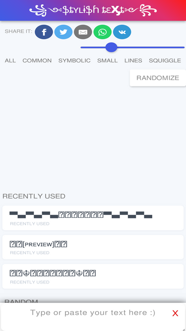 90%Random 𝐹𝒶𝓃𝒸𝓎 𝒯𝑒𝓍𝓉 Generator - Generate Online (っ◔◡◔)っ ♥ ℭ𝔬𝔬𝔩 ♥ and ⓢⓣⓨⓛⓘⓢⓗ random Text Fonts with Symbols, Emojis ✅☆🥰➀ and Letters (easy copy & paste).