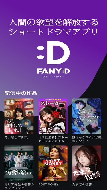 100%FANY:D(ファニーディ)は、SNSで話題の1話1分ちょっとのショートドラマを思いっきり楽しめるアプリです。