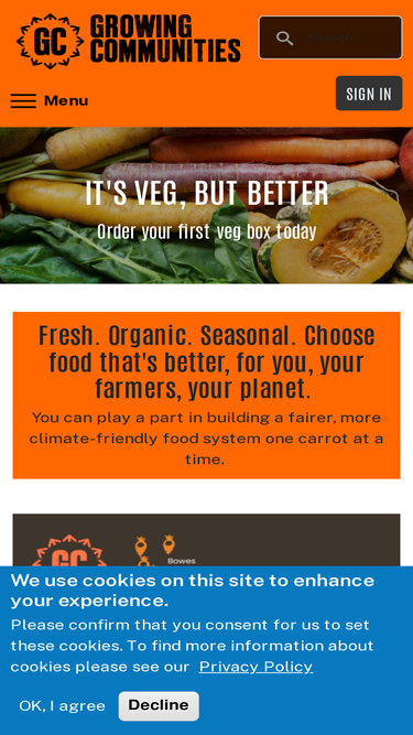 84%Growing Communities is a community-led organisation based in Hackney, north-east London, which has been helping Londoners feel good about their food choices since 1996. We're transforming what we eat, how we eat and how it's farmed for the better. In the face of the climate crisis and damaging corporate dominance, we're making food fairer and more sustainable. We live by a set of core values that guide everything we do: Mission driven We're not in it for the big bucks. Instead, we're all about trading for social good, not just to fill pockets. GC veg scheme members have raised over £80k for local food banks via our Food Credit programme. Transparency & trust We believe honesty is the best policy. That means being upfront about our finances and building solid relationships throughout the food chain. Sustainable sourcing We keep it green, using the Food Zones as a framework, meaning what you buy from GC is always seasonal, organic and grown as locally as possible. Fair trade We are a Living Wage employer paying our farmers and suppliers what they deserve. Ecological advocacy We're on a mission to support farming practices that are good for the earth and its inhabitants. We're proud to be pesticide free and Soil Association certified. Every year we train the next crop of organic growers on our own urban farms. Healthy eating We're all about promoting diets that are good for both people and the planet and it's working - 85% of our members crunch through 5-10 portions of fruit and veg every day! If you want to increase your uptake of fresh, minimally processed and predominately plant-based food, you're in the right place. Low-impact distribution We keep our carbon footprint small by using resources wisely and minimising waste. Every year we save over 250,000 plastic bags, wraps, nets and punnets by prioritising loose produce. We're zero airfreight and working towards zero emissons. Currently, 50%