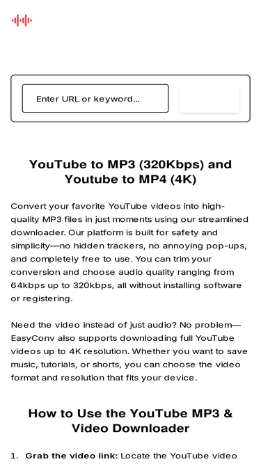 82%Convert YouTube videos to MP3 up to 320kbps or download videos in 4K. EasyConv is fast, ad-free, no registration and works on any device.