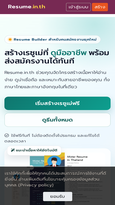 62%สร้างเรซูเม่ที่มีประสิทธิภาพในการสมัครงาน สร้างเรซูเม่อย่างรวดเร็วภายใน 15 นาที รูปแบบสวยงาม Resume.in.th แพลตฟอร์มสร้างเรซูเม่ที่จะช่วยให้คุณสร้างเรซูเม่ของตัวเองขึ้นมาได้อย่างรวดเร็ว
