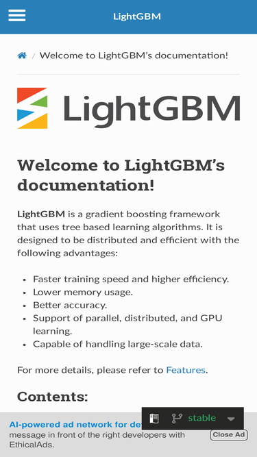 74%Tree based algorithms can be improved by introducing boosting frameworks. LightGBM is one such framework, based on Ke, Guolin et al. (2017) . This package offers an R interface to work with it. It is designed to be distributed and efficient with the following advantages: 1. Faster training speed and higher efficiency. 2. Lower memory usage. 3. Better accuracy. 4. Parallel learning supported. 5. Capable of handling large-scale data. In recognition of these advantages, LightGBM has been widely-used in many winning solutions of machine learning competitions. Comparison experiments on public datasets suggest that LightGBM can outperform existing boosting frameworks on both efficiency and accuracy, with significantly lower memory consumption. In addition, parallel experiments suggest that in certain circumstances, LightGBM can achieve a linear speed-up in training time by using multiple machines.
