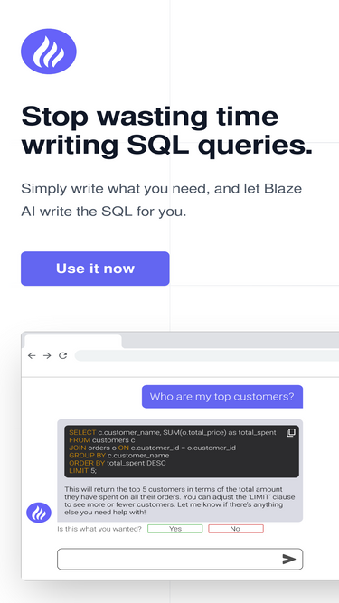 86%this ai data analytics chatbot generates sql queries with ai, like chatgpt for your sql database. connect it to your sql database for cutting edge ai data analysis, and let it work for you.