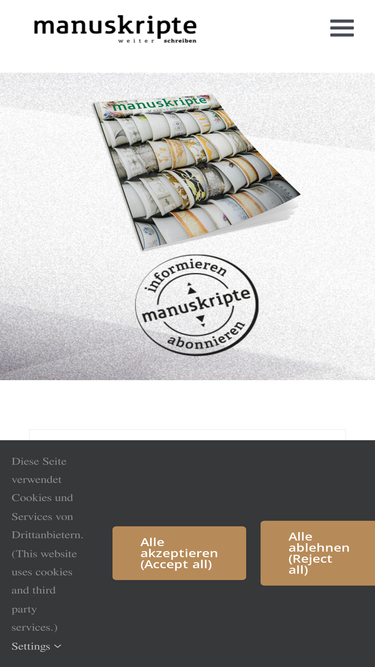 100%Wir bedanken uns herzlich für die Unterstützung! Impressum Angaben gemäß Informationspflicht laut §5 E-Commerce Gesetz, §14 Unternehmensgesetzbuch, §63 Gewerbeordnung und Offenlegungspflicht laut §25 Mediengesetz. manuskripte-Literaturverein ZVR: 515526900 Sackstraße 17, 8010 Graz, Österreich Organschaftliche Vertreter Obmann/Obfrau: Andreas Unterweger Obmann/Obfrau Stellvertreter: Julian Kolleritsch Vereinssitz: Sackstraße 17, 8010 Graz Tel.: +43 316 825608 Fax: +43 316 825605 E-Mail: lz@manuskripte.at