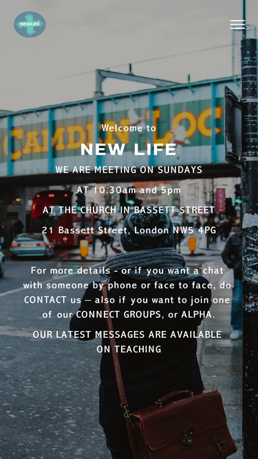 100%Welcome to New LIfe WE ARE MEETING ON SUNDAYS AT 10.30am and 5pm AT THE CHURCH IN BASSETT STREET 21 Bassett Street, London NW5 4PG For more details - or if you want a chat with someone by phone or face to face, do CONTACT us – also if you want to join one of our CONNECT GROUPS, or ALPHA.