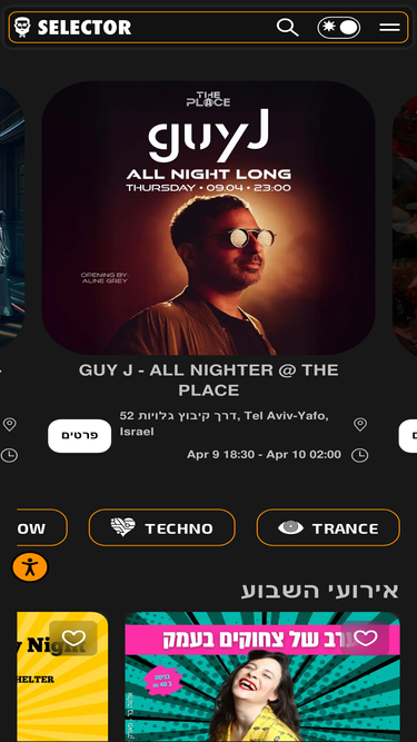 74%ברוכים הבאים לסלקטור – הפלטפורמה האולטימטיבית בשבילך. למציאת והזמנת אירועים המרגשים ביותר בסביבה. הדף הראשי שלנו מציג מבחר של אירועים קרובים ופופולריים, החל מפסטיבלים עוצרי נשימה ועד להופעות לייב בלתי נשכחות ועוד. סלקטור פה בשביל שתוכל למצוא את החוויה המתאימה והאולטימטיבית ביותר שלך. הגיע הזמן להכיר את עולם הבידור וחיי הלילה בצורה שעוד לא הכרת דרך סלקטור!