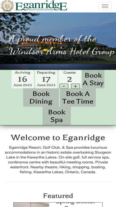 eganridge resort, golf club & spa provides luxurious accommodations in an historic estate overlooking sturgeon lake in the kawartha lakes. on-site golf, full service spa, conference centre with beautiful meeting rooms. private waterfront. nearby theatre, hiking, shopping, boating, fishing. kawartha lakes, ontario, canada.
