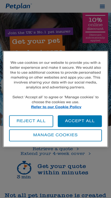 85%Petplan is the UK's leading pet insurer with 40 years’ experience helping pets through illness and injury. Get a quote today and receive 10% off Online.