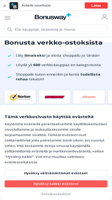 93%Saa rahaa takaisin verkko-ostoksistasi. Osta muotia, matkoja tai viihdettä Bonuswayn kautta ja saat rahaa takaisin ostoksistasi.
