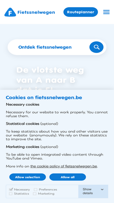 87%Wat staat in jouw woordenboek: fietssnelweg, fietsostrade of cyclostrade? Maakt niet uit: jij zoekt een fijne, vlotte fietsroute. Gevonden! Welkom op fietssnelwegen.be.