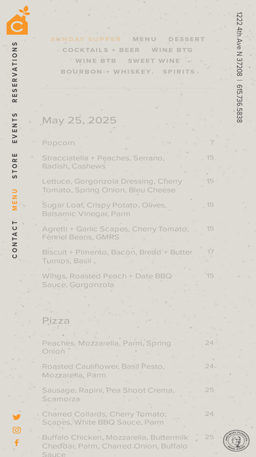 94%City House Nashville • 1222 4th Ave N, Nashville, TN, 37208 • 615.736.5838 Mon-Sat 5-10 • Sun 5-9