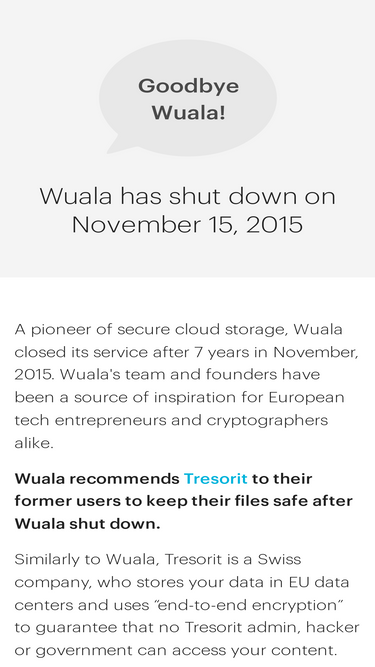 78%encrypted cloud storage wuala shut down completely on 15 november, 2015. wuala recommended its users switch to tresorit, a swiss cloud storage service using end-to-end encryption.