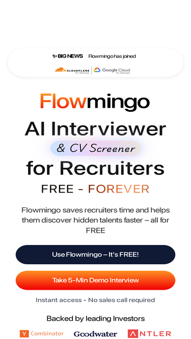 90%Looking for the best free AI interviewer? Flowmingo delivers async AI interviews that cut hiring time by up to 90%, free forever and trusted by leading teams.