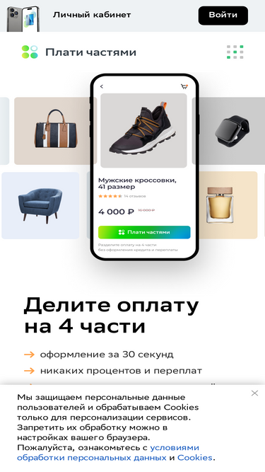 100%Новый сервис «Плати частями» позволяет оплачивать покупки в интернет-магазинах разбивая платеж на 4 равные части. Без процентов, переплат и скрытых платежей.