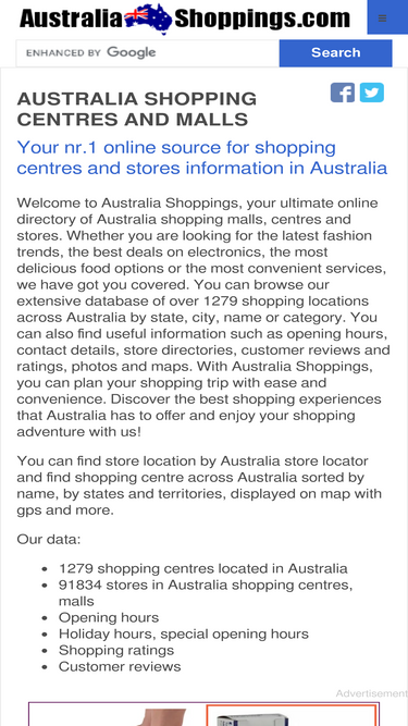 100%find the best shopping locations in australia with australia shoppings. browse over 1288 malls, centres and 92176 stores by state, city, name or category. plan your shopping trip with ease and convenience. business information including map, hours, contacts and phones, customer ratings and reviews. parking information.