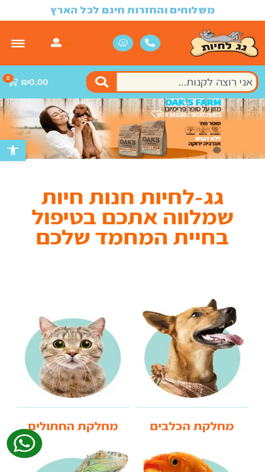 86%חנות חיות המתמחה במשלוחים חינם לתל אביב ירושלים ועוד אזורים של אוכל לכלבים ולחתולים ממותגים מובילים כמו אקאנה, טייסט אוף דה ווילד, פרו פלאן, מונג', נטורל דלישס, רויאל קינן, גו וכמובן גם ציוד ומזון לדגים מכרסמים תוכים וזוחלים.