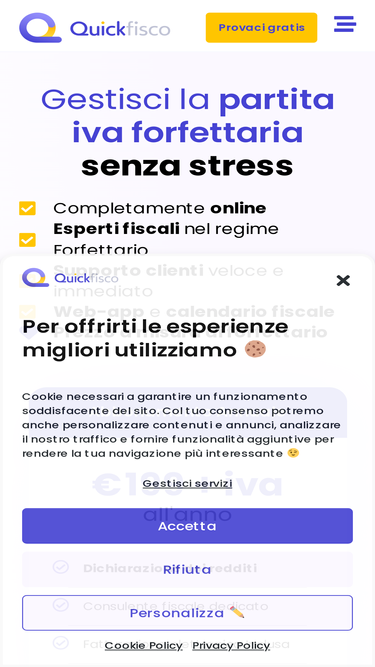 87%Gestiamo la Partita Iva in Regime forfettario, tutto incluso nel prezzo. Prenota la call gratuita con un nostro consulente, senza impegno!