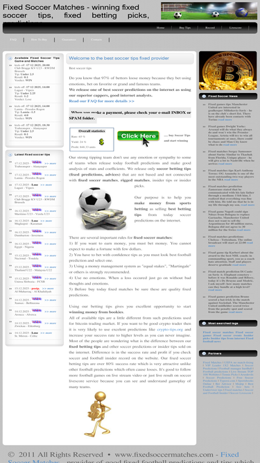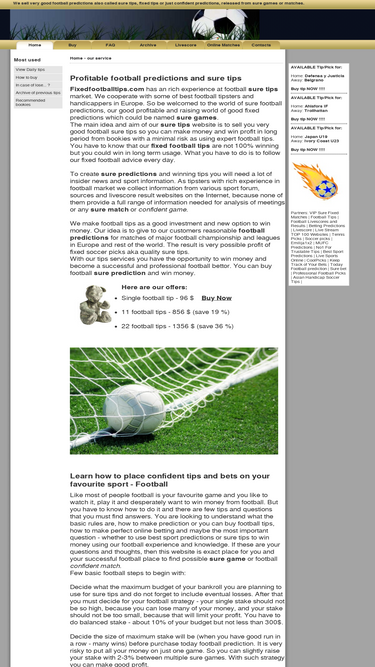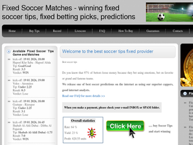 99%fixedsoccermatches.com is soccer tipping provider - deffinately not for fixed matches, rigged matches, fixed games or rigged games but for very good betting picks. we release only quality soccer predictions not insider soccer tips or picks