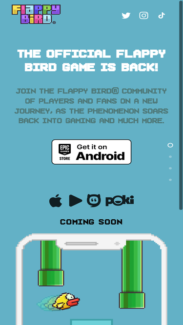 55%Flappy Bird®, the iconic gaming brand, officially returns after a decade. Flappy Bird will go live on platforms including iOS and Android in 2025.