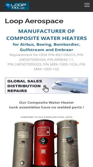 100%MANUFACTURER OF COMPOSITE WATER HEATERS for Airbus, Boeing, Bombardier, Gulfstream and Embraer Replacement for OEM P/N 8921082G5, P/N 24E507040G04, P/N AR9042-11, P/N 24E507009G03, P/N MRX-1000-102A,...