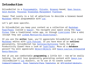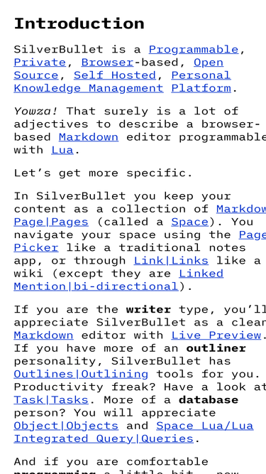 80%IntroductionSilverBullet is a tool to develop, organize, and structure your personal knowledge and to make it universally accessible across all your devices. In SilverBullet you keep your content as a collection of Markdown Pages (called a Space). You na