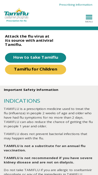 63%Tamiflu® (oseltamivir phosphate) is an antiviral medicine for treatment of flu in people 2 weeks of age and older and for prevention of flu in people 1 year of age and older. See full safety for more information.