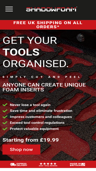 Shadow Foam is the perfect visual management solution for tool control. Being the only product of it's kind, the multi-layered foam allows the user to check all of their tools and equipment are returned with one quick look. Gone are the days of a manual inventory checklist!To get organised requires a simple 2-step process: cut and peel. These packs are available in 9 colours, making the customisation possibilities endless.UV Resistance ensures the colours stay vibrantMade from 100% polyethylene foam, making off-cuts recyclable (where available)HCFC Free and odourless means no strong chemical or solvent smellsProtect items from impact whilst keeping them organisedResistance to water and common chemicalsEasy to clean, simply wipe off any mess (oil, grease etc.)This type of foam has become one of our most popular products, with many customers choosing to buy in bulk. The customisable product is made up of 30mm to 50mm thick foam, really depending on your preference.
