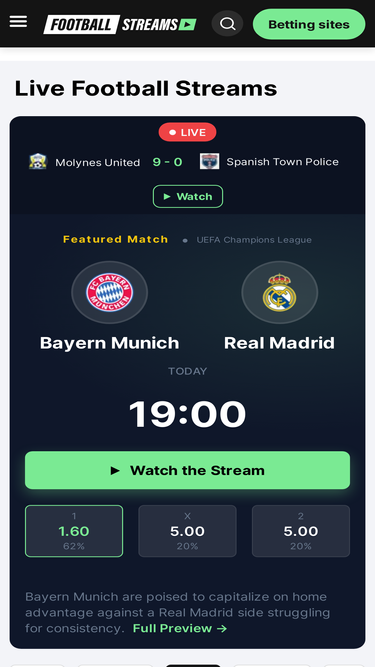 98%Watch every football match live! Stream top leagues, highlights, and replays online. Enjoy seamless football action anytime, anywhere.