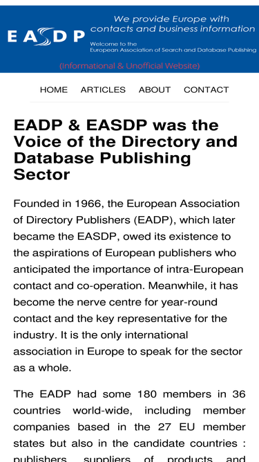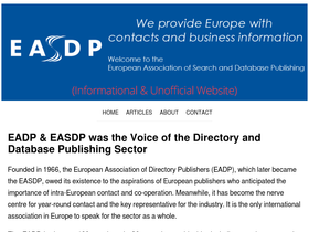 100%the european association of directory and database publishers (eadp) after many years changed its name to the european association of search and database publishing (easdp). the associations activities included: conferences, annual congresses which takes stock of the most pressing issues of the moment, regular news updates about the sector, monitoring european directives which impact on the directory business, and organization of european awards for the best directories.